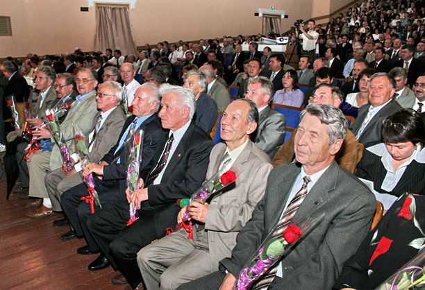 Торжественное собрание. На переднем плане: Р.А. Максутов, В.А. Еронин, Р.Х. Муслимов. На заднем плане: И.Г. Юсупов, Р.Х. Ибатуллин